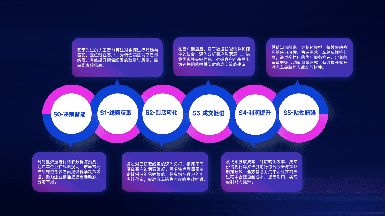 通过拓宽潜在客户来源、、优化线索分配并提高到店转化率,,以增强销售效率。。同时,,利用线索数据不断优化分析模型,,,有效提升转化率,,,,扩大营销影响力。。